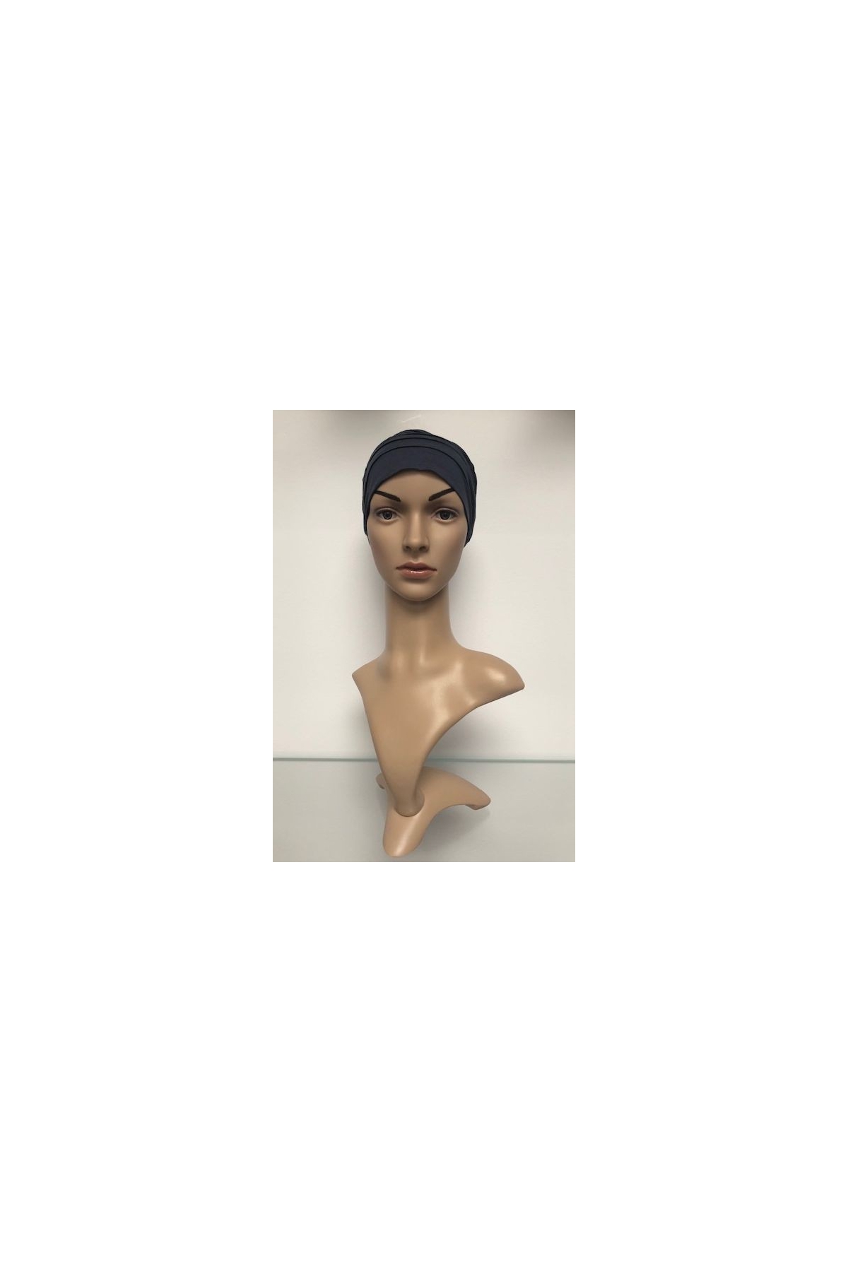Elegantní turban modré barvy. Hodí se pro běžné denní nošení.